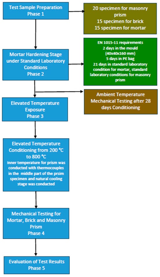 In this study, the fire resistance of HLMs, clay bricks, and masonry prisms was investigated. In this study, mortar and masonry prisms were prepared according to material testing standards, and prism samples were created using this mortar [,,,]. These samples were then subjected to bending and compression tests at temperatures ranging from 200 °C to 800 °C after exposure to high temperatures. Fifty samples were included in the high-temperature tests, with three experimental samples, one temperature-monitored sample, and three reference samples for each temperature. During the elevated temperature tests (ETTs), 20 specimens were prepared for the masonry prism, 15 specimens for the brick, and 15 specimens for the masonry mortar, including three test specimens, one temperature monitoring specimen for each temperature of the masonry prism, and three reference specimens. The reference samples were tested at room temperature, whereas the other samples were held at room temperature after completing the elevated-temperature test and were then tested under the same conditions as the reference samples. No tests were conducted on the temperature-monitoring samples; they were only used to monitor the internal temperatures of the samples using the embedded thermocouples. In this study, all steps were performed according to the flowchart (Figure 1).