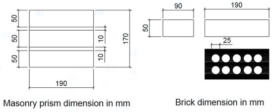 In this study, a Teknorep 520 EX mortar (TEKNO Construction Chemical, İstanbul, Turkey), specially developed for historical buildings in accordance with the EN 998-2:2011 “Specification for mortar for masonry—Part 2: Masonry mortar” standard, was used for utilizing the M15 class natural hydraulic lime []. The technical data for Teknorep 520 EX are presented in Table 1. The mean density of the hardened mortar was approximately 1850 kg/m3. A 190 mm × 90 mm × 50 mm clay brick with voids was used, and the net dry density of the clay brick was 2000 kg/m3. Masonry prisms were prepared with these bricks, and mortar with a 10 mm joint thickness (filled voids) and three bricks was used. (Figure 2)