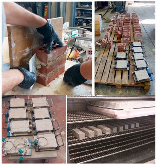 To prepare the specimens, Teknorep520 EX was mixed at a 20/3,1–3,3 water content ratio in the laboratory. Subsequently, the mixed mortar was poured into molds measuring 40 mm × 40 mm × 160 mm according to the specifications outlined in EN 1015-11 []. These specimens were then enclosed in polyethylene bags to maintain a relative humidity of 95% ± 5%, following the guidelines provided in EN 1015-11 [] (Figure 2). After a period of five days, the specimens were extracted from the molds and kept in polyethylene bags for an additional two days for a 7-day duration. Subsequently after this, the specimens were transferred to laboratory conditions of 65% ± 5% relative humidity and 20 °C for further testing. Masonry prisms were prepared with a 10 mm mortar joint with 3 bricks, as shown below detailed in Figure 2 and Figure 3, and they were tested under compression as per ASTM 1314 [].