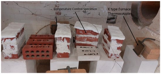 This study conducted six ETTs spanning temperatures ranging from 200 °C to 800 °C in increments of 200 °C. Four specimens were used for each test, with one designated for measuring the mortar temperature and the remaining three for assessing the mechanical properties. Temperature control was performed for the prism only; thus, the remaining mortar and brick specimens were assumed to reach the proposed temperature. Upon reaching the target temperature for each specimen, the furnace cover was removed, both the furnace and specimen were allowed to cool to approximately 100 °C, and the cooling phases were meticulously recorded (Figure 5).