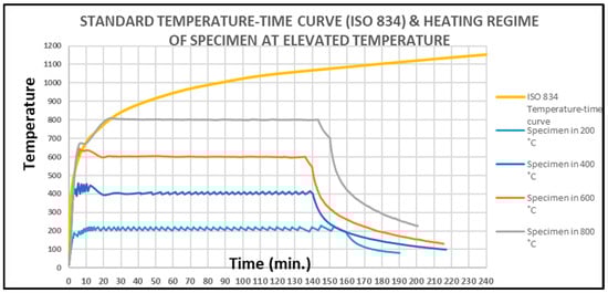 Experimental studies were conducted at the Construction Materials, Fire, and Acoustic Laboratory of the Turkish Standards Institution (TSE) in Istanbul, Turkey. The specimens were subjected to a designated constant temperature (200 °C, 400 °C, 600 °C, and 800 °C) using the ISO 834-1 temperature–time curve []. A specialized furnace powered by natural gas burners was used to achieve these temperatures. To adhere to the EN 1363-1 [] standard and prevent direct flame contact, the specimens were positioned 750 mm away from the furnace burner. Two-plate K-type thermocouples were deployed throughout the tests to regulate the furnace temperature and were positioned 100 mm from the specimens from the four sides, following the guidelines outlined in EN 1363-1 []. In addition, a K-type Inconel thermocouple was used to gauge the temperature of the specimens accurately (Figure 3 and Figure 4). This controlled specimen was used solely to monitor the temperature levels.