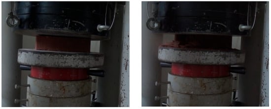The determination of the compressive strength of the brick units is described in EN 1015-11 []. To determine the compressive strength, three specimens were used at each ambient and elevated temperature, and the average values of their compressive and flexural strengths were calculated. A Zwick brand hydraulic testing machine with a capacity of 100 kN was used to determine the compressive strength of the mortar units with dimensions of 40 × 40 × 160 mm according to the specifications outlined in EN 1015-11 []. After the completion of the flexural strength of the three specimens, the compressive strength was measured in the cracked six specimens, as described in EN 1015-11 [], and the average value of the results was calculated (Figure 6).