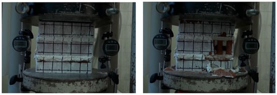 The compressive strength of the masonry units was determined according to ASTM C1314 []. To determine the compressive strength, three specimens were used at each ambient and elevated temperature, and the average compressive strength was calculated. A Besmak brand hydraulic testing machine with 1000 kN capacity was used to determine the compressive strength of the masonry units, similar to a clay brick masonry prism with dimensions of 190 mm × 90 mm × 170 mm (Figure 8). A two-point displacement measurement was recorded, as illustrated in Figure 8, and the average value of these measurements was considered to determine the elastic modulus and strain value of the masonry prism.