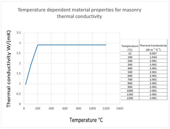 The same masonry prism was used for thermal analysis validation, as detailed above. Two thermocouples were fixed to the middle part of the mortar and brick, as described in Section 5.3. The prism was insulated from the top and bottom parts in order to observe the actual thermal behavior. The masonry prism was exposed to the ISO 834 temperature–time curve [] for one hour, and the temperature values were recorded for comparison with the FEA transient thermal analysis. The calculated values of the temperature-dependent material properties of clay units are given in EN 1996-1-2 [] over the density range of 900 kg/m3–1200 kg/m3. These coefficients were used for the masonry prism transient finite element analysis as the input value of the masonry prism.