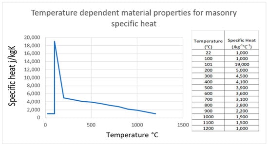 The specific heat, density, and thermal conductivity of the clay units described in EN 1996-1-2 [] are shown (Figure 9).