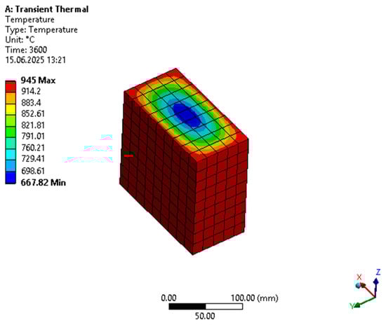 The ISO 834 temperature–time curve was assigned as the boundary condition for masonry from the four sides. A 30 s time interval was input for the transient thermal analysis by following the ISO 834 temperature–time curve []. In addition, convection and radiation boundary conditions were applied to the fire side to illustrate the actual conditions, and modeling was performed using ANSYS Workbench 19.2 with all temperature-dependent material properties and boundary conditions. The boundary condition for convection was set at 25 W/(m2·°C) on the exposed side. The boundary conditions for the radiation were assigned 0.7. A temperature probe was assigned to assess the maximum temperature after the FEA transient heat transfer analysis was performed in ANSYS, as illustrated in Figure 13.