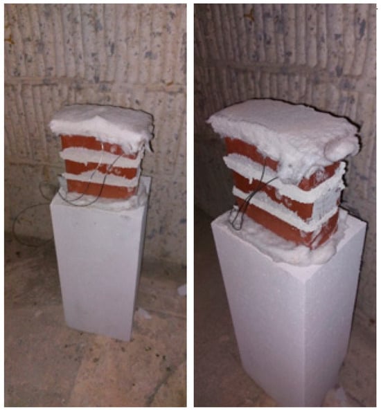 To validate the FEA results, a masonry prism was exposed to an ISO 834 [] fire for 60 min from four sides in the furnace described in EN 1363-1 []. The top and bottom parts of the masonry prism were insulated with ceramic wool to meet the FEA results, which were assumed to be adiabatic in the transient thermal analysis. Two thermocouples (TC1 and TC2) were fixed inside the masonry prism, as illustrated in Figure 14 and Figure 15.