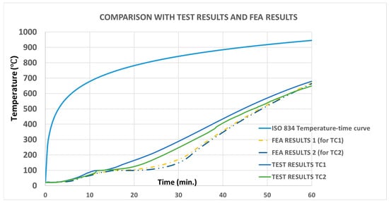 At the end of the 60 min fire exposure, temperature results were 679.1 °C for TC1, 649 °C for TC2, and 661.4 °C for FEA results (Figure 16). It can be concluded that the test results for TC1 668.45 °C, TC2 679.1 °C, and 649 °C (FEA results) for 60 min fire exposure are close to each other by means of engineering calculation point of view. According to the thermal coefficients, as per EN 1996-1-2 [], they can be used for thermal gradient calculations, and the FEA results are compatible with the test results. As a result, even if thermal coefficients are given for different masonry densities, such as 900–1200 kg/m3 as per EN 1996-1-2 [], these coefficients are compatible with and are used as input data for the masonry prism for a density of 1900 kg/m3.
