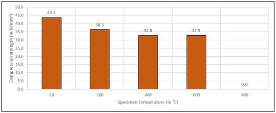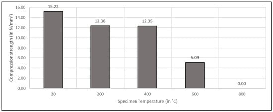 Significant trends over different temperature ranges were observed in the compressive strength analysis. Initially, up to 200 °C, the compressive strength decreased to 80% and remained almost constant up to 400 °C. However, a significant decrease was observed at 600 °C, where the strength decreased to 30% compared to ambient temperature conditions. This trend continued as the temperature increased, with compression strength reaching a mere 30% of the ambient level at 600 °C. These results suggest a critical temperature threshold, above which the structural integrity of the material is significantly compromised (Table 2 and Figure 17). At 800 °C, the three specimens were totally collapsed and reported zero accordingly.