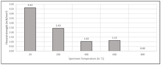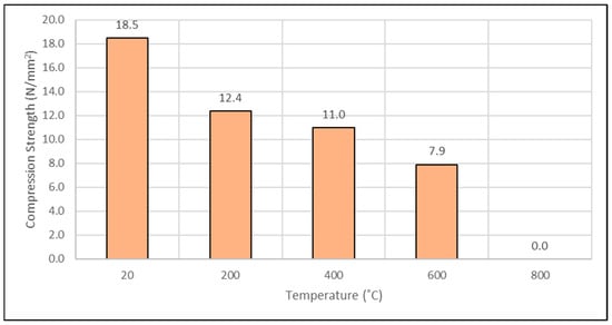 - The flexural strength lime-based mortar reduced to approximately 50% of the ambient value at 200 °C. Subsequently, from 200 °C onwards, there was a gradual decrease of approximately 30% until reaching 600 °C, resulting in zero as a final flexural strength due to total cracking at the 800 °C level. The compressive strength at 200 °C decreased to 80% of the compressive strength observed at ambient temperature. By the time it reached 600 °C, the compression strength had diminished to 5.09 N/mm2, representing 30% of the strength recorded at ambient temperature. However, above 600 °C, the specimens completely collapsed. Despite the decline in strength, the compressive strength at 600 °C (5.09 MPa) still retained considerable strength. Therefore, it can be inferred that this aligns with class M5, according to TBDY 2018 [], EN 1015-11 [], and EC6 [].