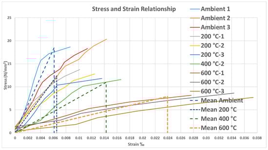 The modulus of elasticity should be determined by testing. In terms of the lack of test results, the short-term modulus of elasticity can be determined by the multiplication factor KE = 1000 with compression strength, unless the national annex gives a different value as per EN 1991-1-1 []. In addition, if the test results are available, then one-third of the ultimate compression test results can be considered with the displacement values. According to the Turkey Building Earthquake Regulation, 2018, as National Annex, the multiplication factor KE can be assumed to be 750 in the absence of test results. However, in most cases, these values deviate. In this study, one-third of the ultimate compressive strength values versus the strain values are listed in Table 8. The modulus elasticity can be approximately calculated for this study as multiplied by KE = 170 with the compression test results for the M15 lime-based mortar. The modulus of elasticity test results for ambient and elevated temperatures are listed in Table 7. Accordingly, the stress–strain relations after the calculation can be found in Table 8 and Figure 21.