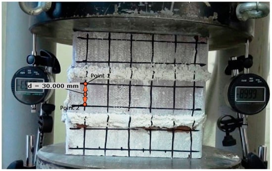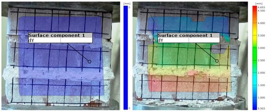 In this study, the cameras were mounted on a tripod and placed in front of the prism specimen during the compression test. To ensure the accuracy of the measurements, it was necessary to utilize the reference points on the surfaces to compensate for any errors that may have occurred. In this study, 30 mm reference points were applied to the surface of the specimen to precisely evaluate and compare the ultimate displacement of the specimen during the compression test. To ensure the accuracy of the measurements, it was necessary to utilize the reference points on the surfaces to compensate for any errors that may have occurred (Figure 22). After the completion of DIC, the ultimate displacement was compared with the average displacement test results at the point of maximum force.