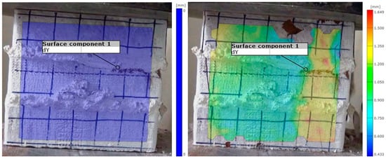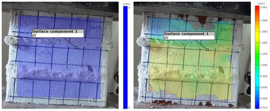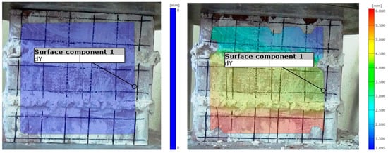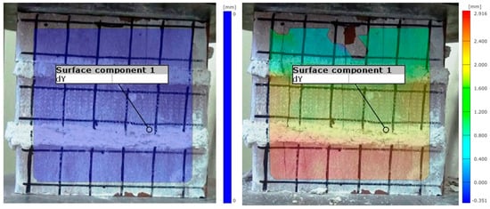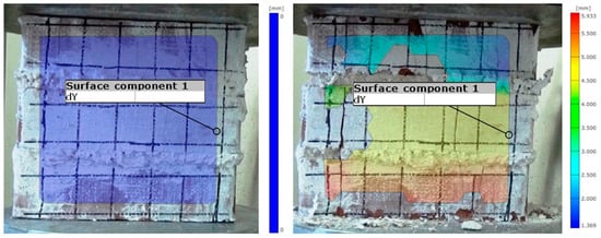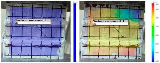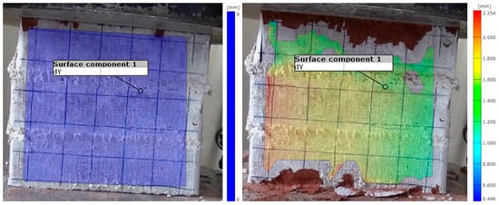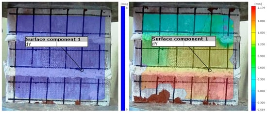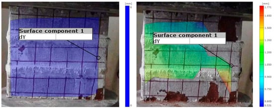 DIC was performed using Zeiss Inspect 2025 Correlate Trial version 2D, Oberkochen, Germany []. The results are illustrated in Figure 23, Figure 24, Figure 25, Figure 26, Figure 27, Figure 28, Figure 29, Figure 30, Figure 31 and Figure 32.
