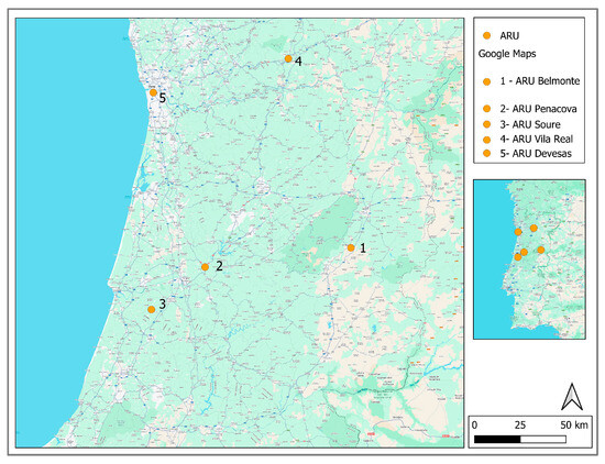 Five ARUs are selected considering their different characteristics (localization, area size, population, residential buildings): Belmonte (village in Castelo Branco district), Soure, and Penacova (villages in the Coimbra district); the historic centre of Vila Real city and district; and Devesas, Vila Nova de Gaia, Porto district (see Figure 2).