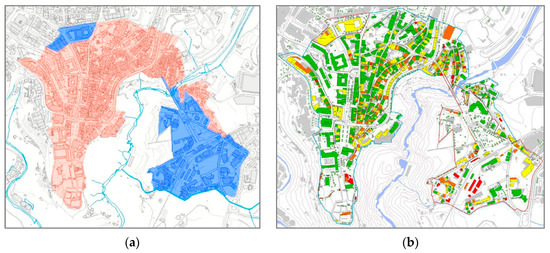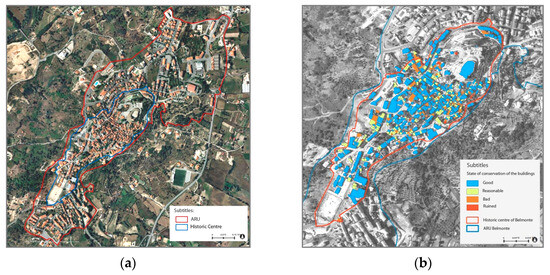 Figure 3. Delimitation of the ARU and Historic Centre of Belmonte (pp. 35 and 134 [41]) as (a) Delimitation on the aerial Orto map; (b) ARU’s Buildings degradation levels, where buildings are good (in blue), reasonable (in yellow), bad (in orange), and ruined (in red).
