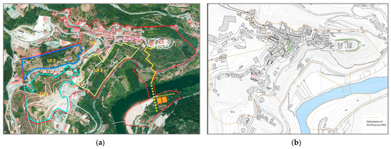 Figure 4. Delimitation of the ARU from the urban area of the Penacova settlement (pp. 18 and 30 [42]): (a) The UIs from the ORU in ARU; (b) ARU delimitation.