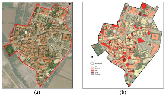 Figure 5. ARU of Soure, limitation in 2012 (pp. 22 and 28 [43]): (a) Delimitation of the ARU of Soure; (b) ARU’s Building degradation levels, where buildings are good (in yellow), reasonable (in pink), bad (in red), ruined (in brown), and in construction (grey).