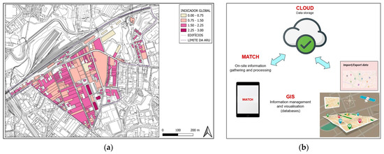 Figure 7. The ARU of Devesas and MATCH Tool: (a) ARU Devesas Buildings’ Overall Indicator of the assessed five dimensions [51].; (b) Prototype of the MATCH tool procedure and its integration with municipal databases for real-time data generation on a Geographic Information System (GIS) geoportal (a, b, 1st author’s schemes).
