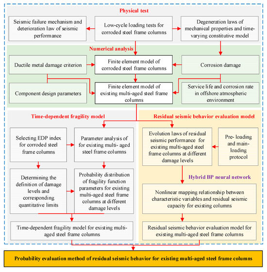 This study begins with a review of experimental studies on the seismic behavior of corroded steel frame columns. Chloride-accelerated corrosion and low-cycle loading tests were conducted on six steel frame columns, and the seismic failure mechanism and deterioration laws of the seismic behavior are revealed. A finite element analysis (FEA) method for corroded steel frame columns is then developed. Subsequently, a classification criterion and theoretical characterization of the damage states is proposed, thus establishing a time-dependent fragility model for existing steel frame columns in offshore atmospheric environments. Furthermore, using the swarm optimization back-propagation neural network (PSO-BPNN) model, a quantitative correlation between the characteristic variables (service age, design parameters, and damage level) and residual seismic capacity is constructed. Finally, by combining the time-dependent fragility and residual seismic behavior evaluation modes, the expected value of the residual seismic capacity for existing multi-aged steel frame columns at a given drift ratio is obtained in a probabilistic sense. The research design is illustrated in Figure 1.