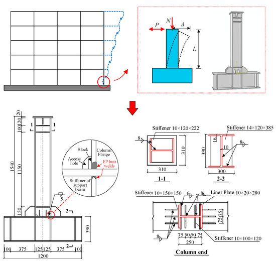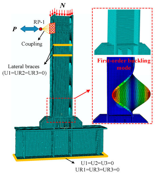 All parts of the model employed C3D8R solid elements and were divided using an adaptive meshing technique with a maximum element size of 15 mm. Local mesh refinement was performed at the column ends, with a minimum element size of 3 mm. Binding constraints were used to simulate welding actions among the parts. The mode boundary and loading conditions were aligned with the tests, with a fixed-end constraint at the bottom of the model and out-of-plane constraints at the sides of the model. Lateral cyclic loads and axial pressure were applied at the column top using “coupling command” and “pressure form,” respectively. Furthermore, an initial imperfection based on the first-order buckling mode of the eigenvalue analysis was introduced to efficiently capture the plate local buckling at the column end, and the maximum defect value was taken as h/5 00 [29]. An implicit Newton-Raphson algorithm was applied. The initial increment size was 0.01, the minimum increment size was 1 × 10−6, and the maximum number of increments was 1 × 106.