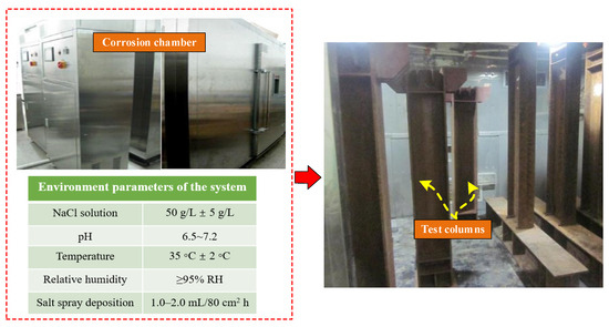 To investigate the seismic failure mechanism and deterioration laws of the seismic performance of corroded steel frame columns subjected to chloride erosion, six steel frame column specimens were designed based on relevant design codes [28,29] and engineering examples. All specimens were fabricated using Q235B hot-rolled H-shaped steel with a cross-sectional specification of HW 250 × 250 × 9 × 14 mm, which was produced by Shaanxi Iron and Steel Group Co., Ltd. in China. Figure 2 shows the geometries and details of the specimens. Referring to the ISO 9227 standard [30], accelerated corrosion in a chloride environment was performed on all the column specimens using the ZHT/W2300 environment simulation system, as shown in Figure 3. Subsequently, low-cycle loading tests were conducted on the corroded column specimens. The test setup and loading protocols are shown in Figure 4. The test parameters include the corrosion level (quantified by the mass loss rate η) and axial compression ratio n (see Table 2). Further details of the tests can be found in the literature. [31].