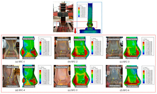 The damage processes of test columns SFC-1 to SFC-6 were similar. At the initial loading, all the columns were in the elastic stage. When loaded to a drift ratio level of 1.5–2%, the columns yielded and entered the elastic-plastic stage, owing to the strain hardening effect, in which visible rotational deformation occurred at the column end, accompanied by the surface rust layer peeling off. However, the deformation recovered after unloading owing to the low level of plastic development. At the 2~3% drift ratio level, slight local buckling was observed at the column end flanges, as well as residual deformation after unloading, owing to the relatively high level of plastic development. At the 3–4% drift ratio level, the horizontal load reached its maximum and then began to decrease, indicating that the columns entered the elastic-plastic softening stage. At this stage, local buckling of the flange was evident, and the web plate warped, indicating the formation of a plastic hinge at the column’s end. When the drift ratio reached 5%, the plastic hinge at the column end was fully developed, and the bearing capacity dropped below 30% of the maximum, indicating column failure.