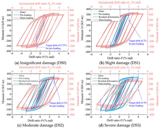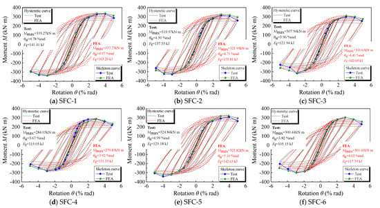 Figure 6 shows the bending moment-rotation (M − θ) hysteresis curves of column specimens, where M and θ can be expressed as Equations (1) and (2), respectively.