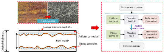 Corrosion in steel is primarily divided into uniform and pitting corrosion. In practical situations, owing to differences in the external corrosion conditions and the material itself, the corrosion morphology of steel has high randomness, without a strict distinction between uniform and pitting corrosion, and is mostly a superposition of the two forms, as shown in Figure 7. Uniform corrosion only causes a reduction in plate thickness but does not lead to material property degradation, and the mechanical performance of the components can be assessed by the residual thickness. However, pitting corrosion can cause stress concentration, resulting in the degradation of the material strength and ductility, making it difficult to predict the performance of components through the thickness reduction. Therefore, this study divided corrosion damage into two parts: uniform corrosion and pitting corrosion, to comprehensively consider the different impact mechanisms on steel column behavior.