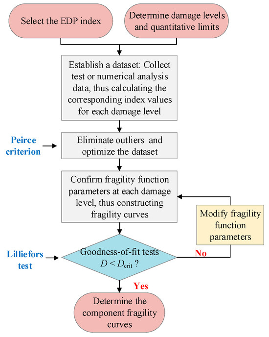 where P(x) and Sn(x) are the fitted fragility and sample cumulative distribution function values, respectively; D is the maximum absolute difference between the two functions; Dcrit is the upper limit of D at the 5% significance level, which can be calculated using Equation (13) and the Monte Carlo simulation method. By comparing D and Dcrit, significant differences in the functional statistics were identified. When D ≤ Dcrit, the assumption of a lognormal distribution of the fragility function is accepted, and the goodness-of-fit test passes. Otherwise, the hypothesis is rejected and the test fails. Figure 9 shows the implementation process of the component fragility curves.
