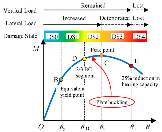 Previous studies [5,34,38] have shown that the drift ratio, as an index of the seismic behavior of steel frame components, can better represent the relationship between the damage level and EDP and have provided the theoretical characterization of each damage state based on the M − θ skeleton curves. On this basis, the equivalent yield point B of the skeleton curve was defined as reaching the slight damage state DS1; point D at 2/3 BC segment was defined as reaching the moderate damage state DS2; peak point C was defined as reaching the severe damage state DS3; and point E, at which the bending bearing capacity decreased by 25%, was defined as reaching the complete damage state DS4, as shown in Figure 10. Table 2 presents the quantitative drift ratio limits for the different damage states of the tested corroded steel columns (SFC-1~6).