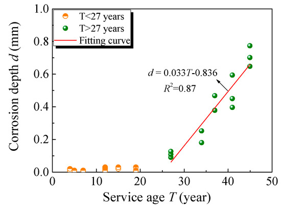 Combining Equation (15) with Equation (3), the mechanical properties of the corroded steel at T-year service life can be obtained as follows: