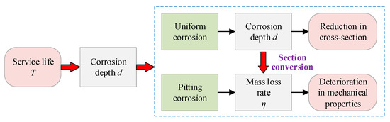 where m0, ρ0, A0 and L0 are the initial mass, density, cross-section area, and length of components, respectively; mT, ρT, AT, and LT are the corresponding physical quantities at T-year service age; Acorr is the section corrosion area.
