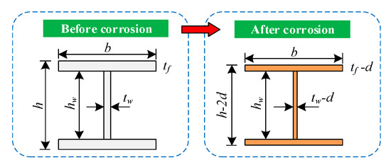 For a H-shaped steel component with a section specification h × b × tw × tf (see Figure 14), initial cross-section area , and cross-section corrosion area at T-year service age , , the mass loss rate η can be converted to: