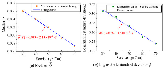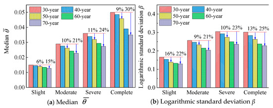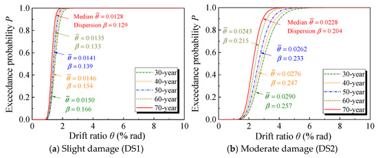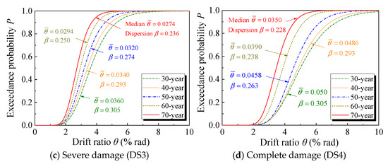 By integrating the test and simulation data, and removing the outliers based on the Pierce criterion, the fragility function parameters (median and logarithmic standard deviation β) of existing steel frame columns at different service ages can be calculated using Equations (8)–(10), as presented in Table 5 and Figure 16. With an increase in service age, the corrosion damage of steel frame columns increased continuously, the seismic performance gradually deteriorated, and the median drift ratios of slight, moderate, severe, and complete damage states gradually decreased. When the service age increased to 50 years, the corresponding slight, moderate, severe, and complete damage states decreased by 6.0%, 9.7%, 11.1%, and 8.4%, respectively. At 70 years of age, the values decreased by 14.7%, 21.4%, 23.9%, and 30.0%, respectively. Simultaneously, the logarithmic standard deviation β of each damage state gradually decreased, indicating that the uncertainty of the drift ratio limit evaluation for steel columns reduced when subjected to environmental erosion. Overall, environmental erosion negatively affected the fragility of the steel frame columns.