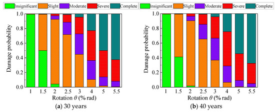 Based on the proposed time-dependent fragility model for existing multi-aged steel frame columns (see Equation (20)), the exceedance probability of all damage states at a given drift ratio (i.e., the damage probability matrix) can be mathematically expressed as: