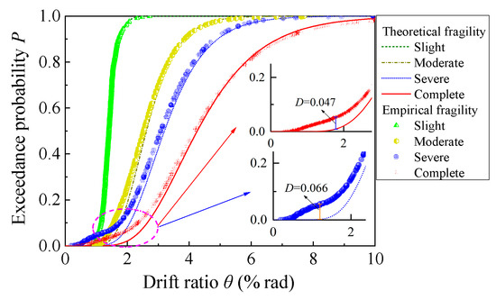 The main stages of establishing component fragility curves are as follows: (1) Select the EDP index that can characterize the seismic behavior of the components. (2) Divide the damage levels of the components and identify the corresponding quantitative limits. (3) A dataset is constructed to calculate the probability distribution of the fragility function parameters. (4) Eliminate outliers based on the Peirce criterion and optimize the dataset. (5) Confirm the median and logarithmic standard deviation at each damage level using the maximum likelihood estimation method and construct the fragility curves. (6) Perform goodness-of-fit tests on the fragility curves based on the Lilliefors method (represented as Equations (11)–(13)), verifying whether they meet the assumed lognormal distribution and examining the correlation between the data samples and fitting values.