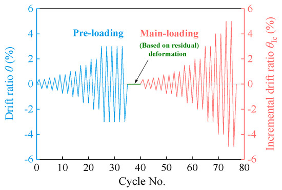The prediction of the residual seismic behavior of earthquake-damaged components is also an important part of seismic resilience assessment and an important basis for the functional restoration and reconstruction of post-earthquake structures, which is of great significance for improving disaster prevention and mitigation capabilities and the scientific decision-making level [18]. The JBPDA Guideline [19] and FEMA 306 [20] adopted a reduction factor η to determine the residual seismic capacity of the structural components. Alwashali [21] studied the influence of pre-damage levels on the residual seismic performance of RC shear walls using cyclic loading tests. Harrington [22] performed a seismic performance evaluation of RC frames with retrofitted columns designed to meet the ASCE 41damage levels (with CP, LS, and IO states). Khanmohammadi [23] studied the residual capacity of mainshock-damaged prestressed bridges subjected to vertical earthquake ground motions. Chiu [24] experimentally quantified the post-earthquake residual seismic capacity of RC columns with flexural, flexural-shear, and shear failure modes. Zhang [25] developed a pattern recognition approach to quantitatively assess the residual structural capacity of earthquake-damaged tall buildings by using sequential nonlinear response history analyses. Cavaleri [26] investigated the residual out-of-plane stiffness and strength of infills damaged by in-plane cyclic loads using an extended numerical experiment. Using a machine learning method, Asgarkhani [27] proposed a reliable prediction model for the residual seismic behavior of steel moment-resisting frames, considering the soil-structure interaction.