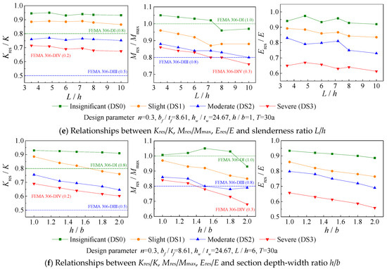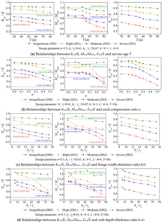 Figure 23 shows the typical variation relationships between Kres/K, Mres/Mmax, Eres/E, and the column parameters at different earthquake damage levels. It can be observed that (1) in the insignificant damage state (DS0), the steel columns suffered less damage, and the initial stiffness, bearing capacity, and energy dissipation were reduced to some extent, but within 8%, as the parameters changed. (2) For damage states DS1–DS3, under the research range of parameters and same conditions, with an increase in the service age T, Kres/K exhibited a linear decline, Mres/Mmax decreased with a negative exponential trend, and Eres/E decreased linearly. (3) With an increase in the axial compression ratio n, Kres/K, Mres/Mmax, and Eres/E all decreased with a negative exponential trend. (4) With an increase in the flange width-to-thickness ratio bf/tf and web depth-to-thickness ratio h/tw, Kres/K and Mres/Mmax decreased exponentially, and Eres/E decreased linearly. (5) The effect of the slenderness ratio L/h on Kres/K and Eres/E was irregular, but Mres/Mmax decreased gradually as L/h increased. (6) With an increase in the section depth-width ratio h/b, Kres/K, Mres/Mmax, and Eres/E decreased gradually.