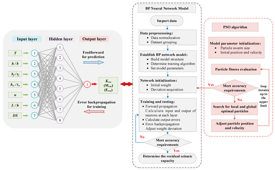 Ref. [31] indicated that web shear instability failure of H-shaped steel members should be avoided in project design because it restricts plastic development and degrades the bearing performance. Therefore, by excluding the parameter analysis results that caused web shear instability and high dispersion, the datasets of Kres/K, Mres/Mmax, and Eres/E for existing steel frame columns under different design parameters, service ages, and damage levels were obtained. Subsequently, using the PSO-BPNN model in MATLAB R2021a [47,48], the nonlinear mapping relationships between the characteristic variables (design parameters, service age, and damage level) and residual seismic capabilities (Kres/K, Mres/Mmax, and Eres/E) of existing steel frame columns were established (see Equation (21)). The operational flow of the PSO-BPNN model is shown in Figure 24.