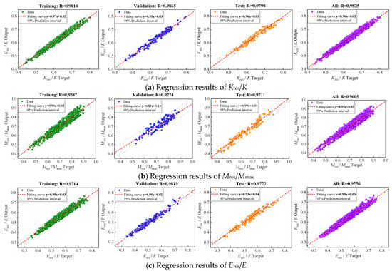 Figure 25 presents an example of the regression results of the PSO-BPNN model for the severe damage state (DS3), and the explicit expressions are derived in Appendix A. The correlation coefficients R for Kres/K, Mres/Mmax, and Eres/E on the training, validation, testing, and all datasets were above 0.96. 96% of the samples in the dataset fell within the regression interval with a 95% confidence level, indicating good simulation accuracy. Table 9 shows the performance of the PSO-BPNN model, which is reflected by the determination coefficient R2 and root mean square error (RMSE). These results demonstrate that the constructed PSO-BPNN model can effectively avoid overfitting and has good accuracy and prediction.