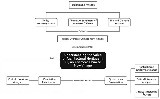 Despite sustained and in-depth scholarly inquiry into Overseas Chinese New Villages since the twentieth century, current research is confronted with dual challenges: significant geographical imbalance and a lack of systematic analytical frameworks [39]. Scholarly attention has been predominantly concentrated on architectural heritage in major diaspora hubs such as Guangzhou and Shanghai, leaving critical academic gaps in the systematic investigation of the Fujian case. Regionally, the persistent focus on Guangzhou has resulted in a conspicuous absence of systematic studies on the Minnan diaspora settlements. This geographical disparity has contributed to fragmented conservation practices and the absence of a cohesive regeneration framework. Methodologically, existing research tends to be confined to singular dimensions–such as residential planning, landscape design, or policy interpretation–while a systematic analysis of the holistic value system specific to Fujian’s Overseas Chinese New Villages remains underdeveloped [40]. Furthermore, assessments have largely been restricted to unidimensional economic evaluations from a twentieth-century architectural heritage perspective, failing to implement quantitative multidimensional value assessments. Consequently, a dedicated value assessment framework for the Fujian settlements has not been established, rendering conservation and adaptive reuse efforts scientifically underinformed and thus inadequate for addressing regional challenges like insufficient recognition and protection. The development and application of such a comprehensive framework are therefore imperative for effective heritage practice. Table 2 lists representative studies related to Overseas Chinese New Village, summarizing the research period, core content, and limitations of these scholars’ studies.
