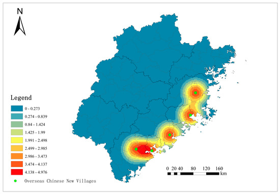 K is the kernel function, h is the bandwidth, n is the number of known points within the bandwidth, and d is the dimension of the data. The bandwidth parameter (h), representing the search radius that determines the area surrounding each cell for density computation, was set at 0.5 m in this study. This empirically determined value was selected to optimally reveal the spatial aggregation characteristics of Fujian’s Overseas Chinese New Villages through the generated density surface.