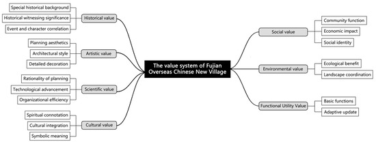 A multidimensional value system for the architectural heritage of Overseas Chinese New Village was established through critical analysis of relevant literature, informed by a comprehensive examination of their historical development, current conditions, and distinctive characteristics in Fujian Province. This framework is comprehensively explicated across seven distinct value dimensions: historical value, artistic value, scientific value, cultural value, social value, environmental value, and functional value (Figure 5).