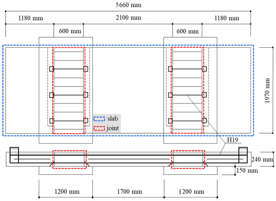 Figure 2 shows the slab side and upper road with dimensions of 5660 × 1970 × 240 mm, and the joint width is set to 600 mm. The specimen was designed based on structural calculations performed according to the concrete design standards and concrete bridge design standards [56,57]. The reinforcement bars used were H19, and the yield strength of the reinforcement bars was 400 MPa. The concrete used in the joint was non-shrinkage concrete with 27 MPa and 40 MPa, respectively, for each parameter.