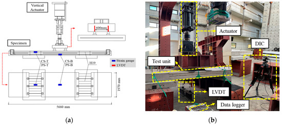 The four-point loading test analyzed the bending performance of the transverse joint between the slab using the CIP method and the slab using the PC method. Figure 4 shows the setup of the four-point loading experiment. The actuator’s capacity was 2000 kN, and its total length was 3214 mm. The total length from the end of the actuator to the bottom of the specimen fixture was set to 6300 mm. A steel rod with a diameter of 40 mm and a length of 600 mm was installed between the actuator and the specimen. In addition, a loading plate measuring 150 × 19 × 600 mm was placed at the bottom of the steel rod to apply the load. The load was applied longitudinally using an actuator to induce stress throughout each specimen. The loading method was applied at four points, considering the tire ground pressure based on the vehicle load [58]. The actuator applied the load in displacement-controlled mode at a rate of 1 mm/min [59]. The load application points were applied at 600 mm intervals from the center of the top of the specimen (Figure 4a). The slab specimen was supported in a simply supported condition using steel frames and rubber pads at both ends, allowing vertical displacement and rotation while minimizing edge restraint. Experimental data were collected using a data logger (TDS-540), and the crack modes of the specimen were analyzed using the digital image correlation (DIC), technique. A spray was applied to the surface of the specimen to form a speckle pattern, and a high-speed PCIe camera was used to capture images at a rate of 1 frame per second to measure strain and displacement (Figure 4b). The specimens were categorized according to the method and strength used, as shown in Table 1. Except for the joint regions, the rest of the slab was fabricated using concrete with a compressive strength of 27 MPa. For example, the slab using the CIP method with a strength of 27 MPa was designated as “CS-27,” and the slab using the precast method with a strength of 40 MPa was designated “PS-40.” Strain gauges were categorized by the slab type and installation location; the details are provided in Table 2. Strain gauges and linear variable displacement transducers (LVDTs) were installed on each specimen to measure the deformation and displacement of the specimens. The strain gauges were attached to the top and bottom of both CS and PS, while the LVDT was installed at the center bottom of the slab. All strain gauges were calibrated prior to installation according to manufacturer loading test analyzed. The measurement error margin was within ±1%, as stated by the strain gauge manufacturer.