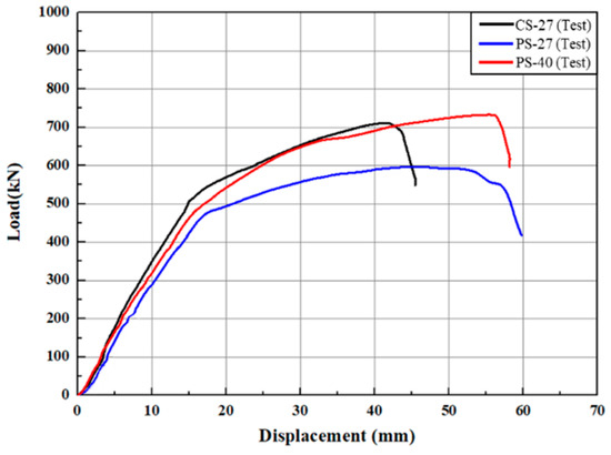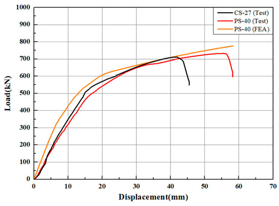 Figure 10 is a load–displacement graph comparing the experimental results of CS-27 and PS-40 with the PS-40 (FEA) results. PS-40 (FEA) experienced yielding of the rebar at approximately 580 kN, and the maximum load of PS-40 (FEA) was 780 kN. The PS-40 (test) curve and the PS-40 (FEA) curve showed similar shapes in the nonlinear behavior after yielding, and there was a tendency for them to match at the point of maximum load and in the subsequent strength reduction phase. The FEA model showed slightly higher stiffness compared to the experiment, but the error in maximum load was within 6%, demonstrating the accuracy of the FEA model. Therefore, the FEA model proposed in this study can predict bending behavior.