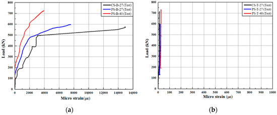 Figure 6b compares the strain measured at the top of the joint of the specimen according to the load. Overall, the strain was measured to be a maximum of about 25 με or less in all three specimens. When the load was applied to CS-27, a strain level of approximately 10–15 με occurred. PS-27 showed approximately 20 με at loads over 200 kN. PS-40 also showed the highest strain level of 25 με among the specimens under loads exceeding 200 kN. Overall, all three specimens exhibited minimal strain at the top of the joint. These results are due to the joint exhibiting structurally integral behavior. PS-40 experienced a somewhat larger strain compared to CS-27, but the difference was limited to within 5 με. Therefore, PS-40, which applied the open-type joint method, can achieve a joint performance level similar to that of CS-27.