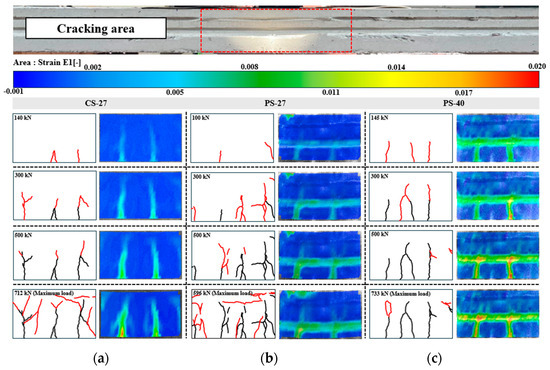 Figure 5 shows the displacement graph of the specimen according to the load. All three specimens exhibited similar initial stiffness. Additionally, as the load increased, nonlinear behavior after yielding was observed. The yield load was measured at 500 kN for CS-27 and 550 kN for PS-40. The maximum load of CS-27 was 710 kN, and the maximum load of PS-40 was approximately 730 kN. PS-27 had a yield load measured at 480 kN and a maximum load of 600 kN, showing the lowest structural performance among the three specimens. PS-40 exhibited similar structural behavior when compared to CS-27. This behavior can be attributed to the improved material properties of the 40 MPa non-shrinkage concrete used in PS-40, which contributed to increased load-carrying capacity and enhanced bonding performance at the joint. In contrast, PS-27 exhibited lower performance due to the relatively low strength of the concrete, which may have resulted in earlier cracking and reduced joint integrity. These differences highlight the critical role of concrete compressive strength in ensuring the structural effectiveness of precast slab joints. As a result, when the strength of non-shrinkage concrete is above 40 MPa, the PS joint can achieve structural performance similar to that of a slab joint constructed using the CIP method.