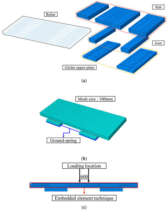FEA was performed to analyze the structural behavior of PS with the open-type joint method. Before the analysis, the parameters for the comparative analysis were listed as shown in Table 3. The analysis utilized the general-purpose structural analysis software ABAQUS (2021). The total size of the analysis model was set to 5660 × 1970 × 240 mm, the same as the experimental specimen. The modeled components consisted of a slab, joint, girder upper plate, and rebar. The slab, joint, and girder upper plate were implemented as C3D8R solid elements. The contact surfaces of each member cannot be considered fully integrated, so they were modeled using spring elements (connecting two nodes). Rebars were modeled using the T3D2 truss element, and the steel bars used for load application were modeled using the B31 beam element (Figure 8a). The support conditions for the underside of the slab were set to the ground-spring type, identical to the experiment. To realistically reflect the ground behavior, nonlinear springs were applied with stiffness values derived from assumed soil conditions. The mesh of the analysis model was set to h/L = 0.1 for curvature control and a size of 100 mm. The mesh shape was applied with a structured hex mesh to prevent twisting (Figure 8b). The rebars were configured to be embedded within the concrete using the embedded element technique. The load was set to 800 kN and applied at 600 mm intervals (Figure 8c).