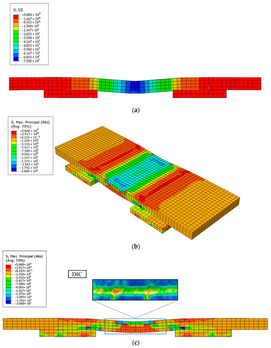 Figure 9a shows the principal stress distribution for PS-40 (FEA). The principal stresses of PS-40 (FEA) are concentrated in the load application position, and tensile stresses are especially high at the bottom of the slab. These results indicate that bending behavior occurred in the central part of the slab under load, causing tensile forces to act on the lower part. Stress concentration also partially occurred at the joint and girder upper plate. As the load is applied to the center of the slab, tensile and compressive forces occur, and due to the reaction force, compressive forces are concentrated at the joint. Figure 9b shows the displacement distribution of PS-40 (FEA) under the same load conditions. The bending behavior under load application was concentrated in the center of the slab, resulting in maximum deflection. The displacement distribution showed a tendency to reach its maximum value at the center of the slab and gradually decrease toward both ends. In particular, the displacement near the girder upper plate was small. This is because the node condition effectively suppresses the load and vertical displacement of the slab. Figure 9c compares the central strain distribution of PS-40 measured using the DIC technique with the finite element analysis results obtained using ABAQUS. Both the experimental results and the analysis results showed a similar stress distribution with stress concentrated around the joint. The stress appeared relatively lower in PS-40 (FEA). This trend indicates that the nonlinear finite element analysis quantitatively reproduces the bending behavior observed in the experiments. Therefore, the proposed analysis model will be able to predict structural performance under various variable conditions.